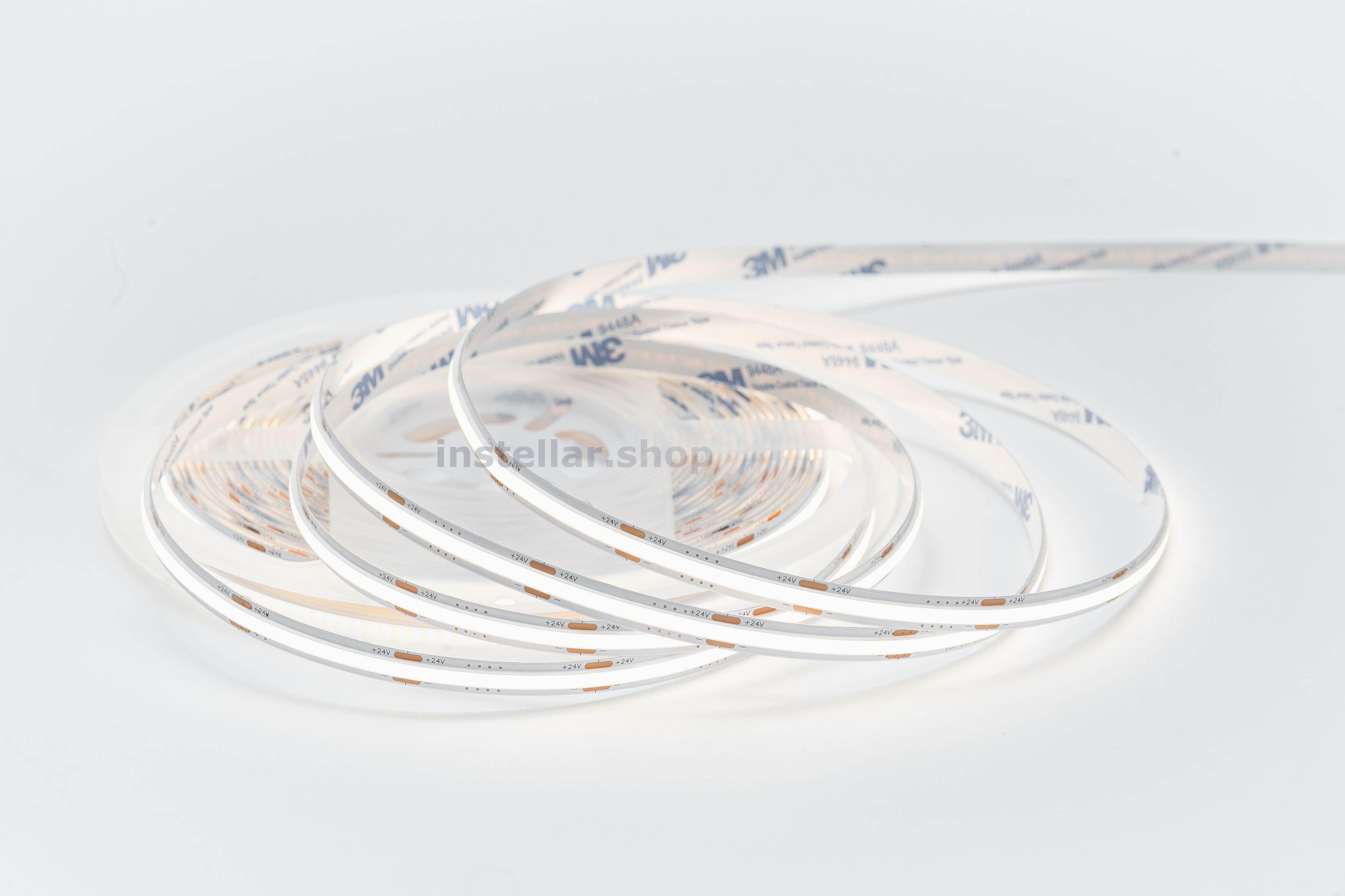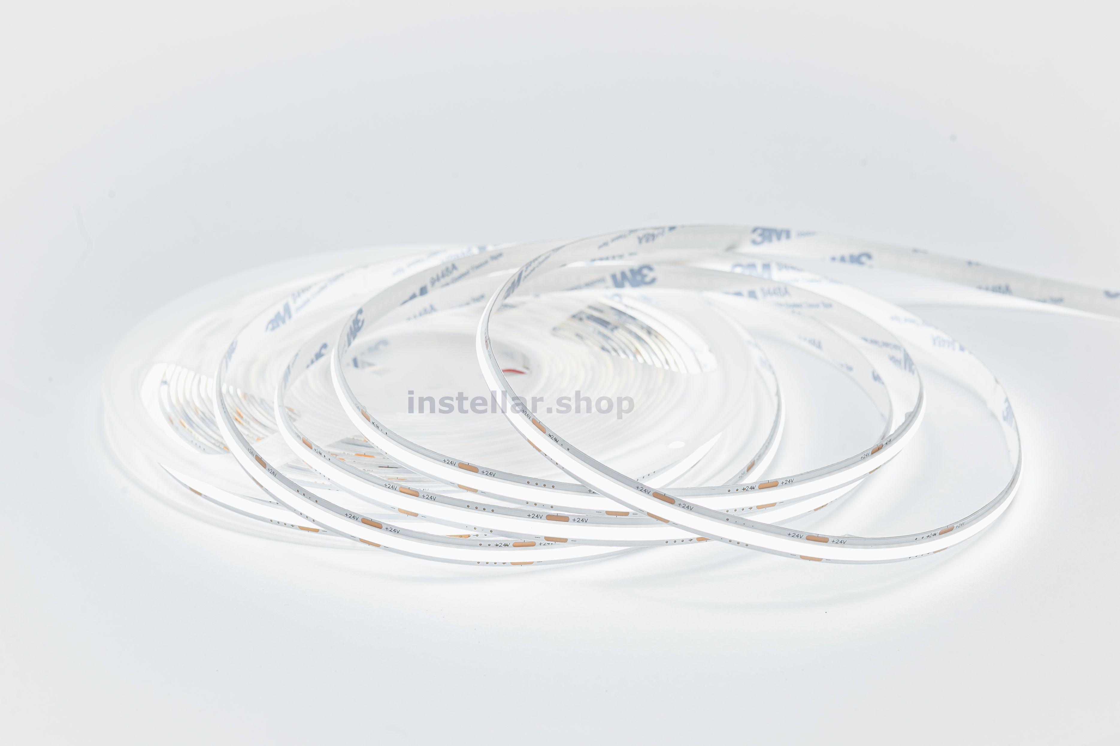 Светодиодная лента на гибкой медной основе с клейким основанием 3М, имеет 1 ряд светодиодов, ширину 8 мм. Тип светодиодов COB (Светодиодная лента COB производится с использованием технологии Chip-on-Board, что переводится как "микросхема на плате". Диоды в такой ленте припаяны не к корпусу, а затем к плате, а напрямую к печатной плате с последующей изоляцией сверху). Напряжение питания постоянное 24 вольта 320 светодиодов на 1 метр Класс защиты IP20 (IP20 — маркировка степени защиты оболочки электрооборудования (Ingress Protection Code). Она обозначает комбинацию двух цифр Первая цифра (2) — защита от проникновения твёрдых предметов размером более 12,5 мм (например, пальцев рук, толстых кабелей). Вторая цифра (0) — отсутствие защиты от влаги (конденсата, брызг, дождя и т.д.) Цветовая температура 4000 Кельвинов (Цветовая температура — это характеристика, которая определяет оттенок света, излучаемого источником освещения. Визуально она определяет, насколько свет кажется "тёплым" или "холодным"). Мощность потребления составляет 10 ватт на 1 метр Индекс цветопрередачи CRI > 80 (Значение индекса цветопередачи (CRI, Color Rendering Index) выше 80 означает, что искусственный источник света точно передаёт цвета объектов по сравнению с естественным освещением). Кратность резки составляет 3,9 см, (это длина шага, позволяющего делить ленту на самостоятельные модули с минимально возможной длиной свечения).