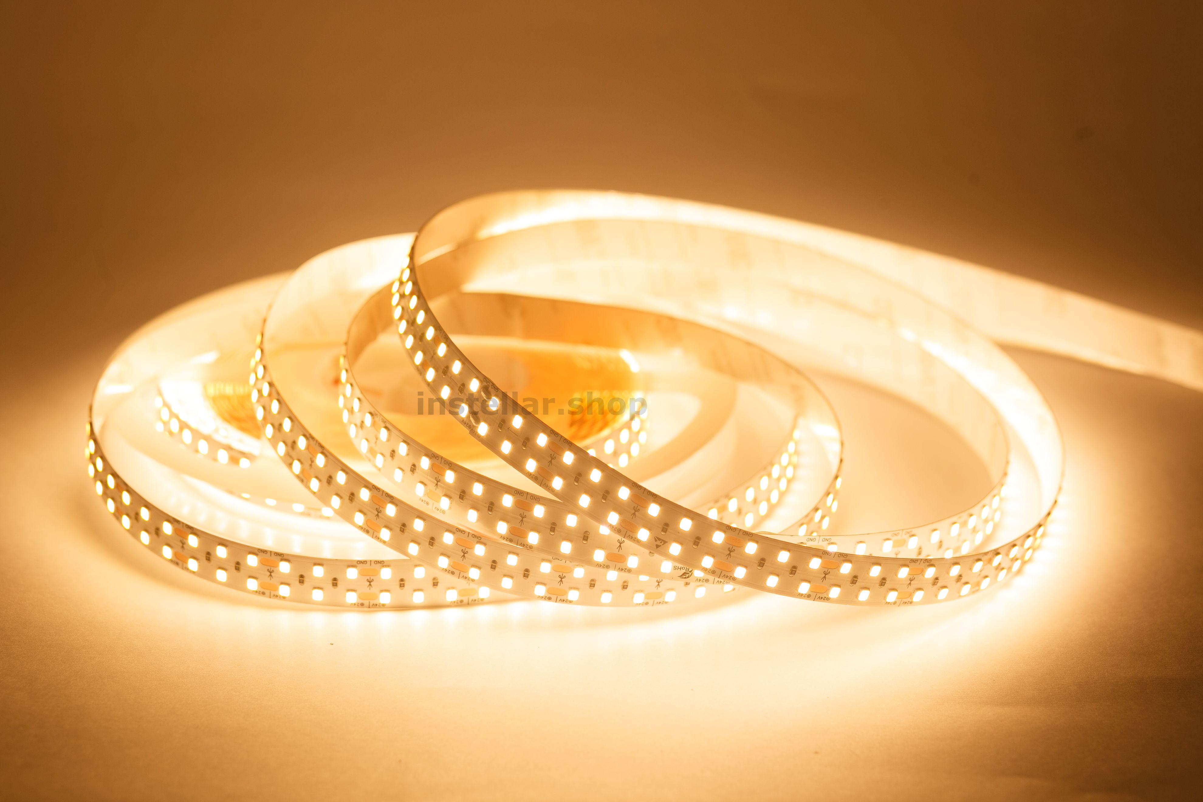 Светодиодная лента на гибкой медной основе с клейким основанием 3М, имеет 2 ряда светодиодов, ширину 15 мм Тип светодиодов SMD2835 (SMD 2835 — обозначение типоразмера светодиода для поверхностного монтажа (Surface Mounted Device) SMD — аббревиатура, которая означает "устройство, монтируемое на поверхность". 2835 — четырёхзначное число, указывающее на габариты светодиода: ширину — 2,8 мм, длину — 3,5 мм. Напряжение питания постоянное 24 вольта 240 светодиодов на 1 метр Класс защиты IP20 (IP20 — маркировка степени защиты оболочки электрооборудования (Ingress Protection Code). Она обозначает комбинацию двух цифр Первая цифра (2) — защита от проникновения твёрдых предметов размером более 12,5 мм (например, пальцев рук, толстых кабелей). Вторая цифра (0) — отсутствие защиты от влаги (конденсата, брызг, дождя и т.д.) Цветовая температура 3000 Кельвинов (Цветовая температура — это характеристика, которая определяет оттенок света, излучаемого источником освещения. Визуально она определяет, насколько свет кажется "тёплым" или "холодным"). Мощность потребления составляет 19,2 ватт на 1 метр Индекс цветопрередачи CRI > 80 (Значение индекса цветопередачи (CRI, Color Rendering Index) выше 80 означает, что искусственный источник света точно передаёт цвета объектов по сравнению с естественным освещением). Кратность резки составляет 2,5 см, (это длина шага, позволяющего делить ленту на самостоятельные модули с минимально возможной длиной свечения).