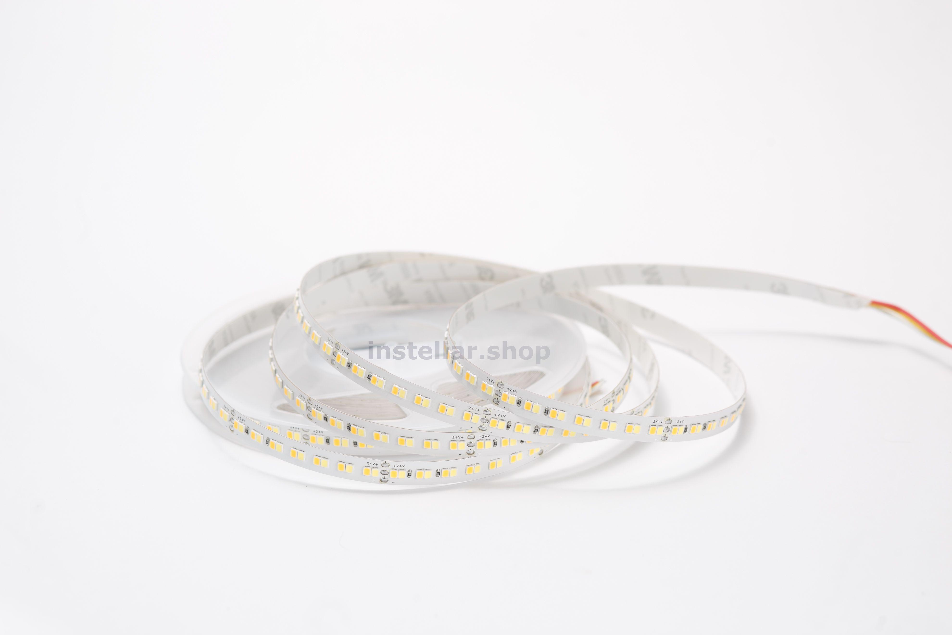 Светодиодная лента на гибкой медной основе с клейким основанием 3М, имеет один ряд раздельных светодиодов с разной цветовой температурой, ширину 10 мм Тип светодиодов SMD2835 (SMD 2835 — обозначение типоразмера светодиода для поверхностного монтажа (Surface Mounted Device) SMD — аббревиатура, которая означает "устройство, монтируемое на поверхность". 2835 — четырёхзначное число, указывающее на габариты светодиода: ширину — 2,8 мм, длину — 3,5 мм. Напряжение питания постоянное 24 вольта Мощность 18 Ватт на 1 метр 224 светодиода на 1 метр Класс защиты IP20 (IP20 — маркировка степени защиты оболочки электрооборудования (Ingress Protection Code). Она обозначает комбинацию двух цифр Первая цифра (2) — защита от проникновения твёрдых предметов размером более 12,5 мм (например, пальцев рук, толстых кабелей). Вторая цифра (0) — отсутствие защиты от влаги (конденсата, брызг, дождя и т.д.) Цветовая температура 3000+6000 Кельвинов (Цветовая температура — это характеристика, которая определяет оттенок света, излучаемого источником освещения. Визуально она определяет, насколько свет кажется "тёплым" или "холодным"). Мощность потребления составляет 18 ватт на 1 метр Индекс цветопрередачи CRI > 80 (Значение индекса цветопередачи (CRI, Color Rendering Index) выше 80 означает, что искусственный источник света точно передаёт цвета объектов по сравнению с естественным освещением). Кратность резки составляет 6,2 см, (это длина шага, позволяющего делить ленту на самостоятельные модули с минимально возможной длиной свечения).