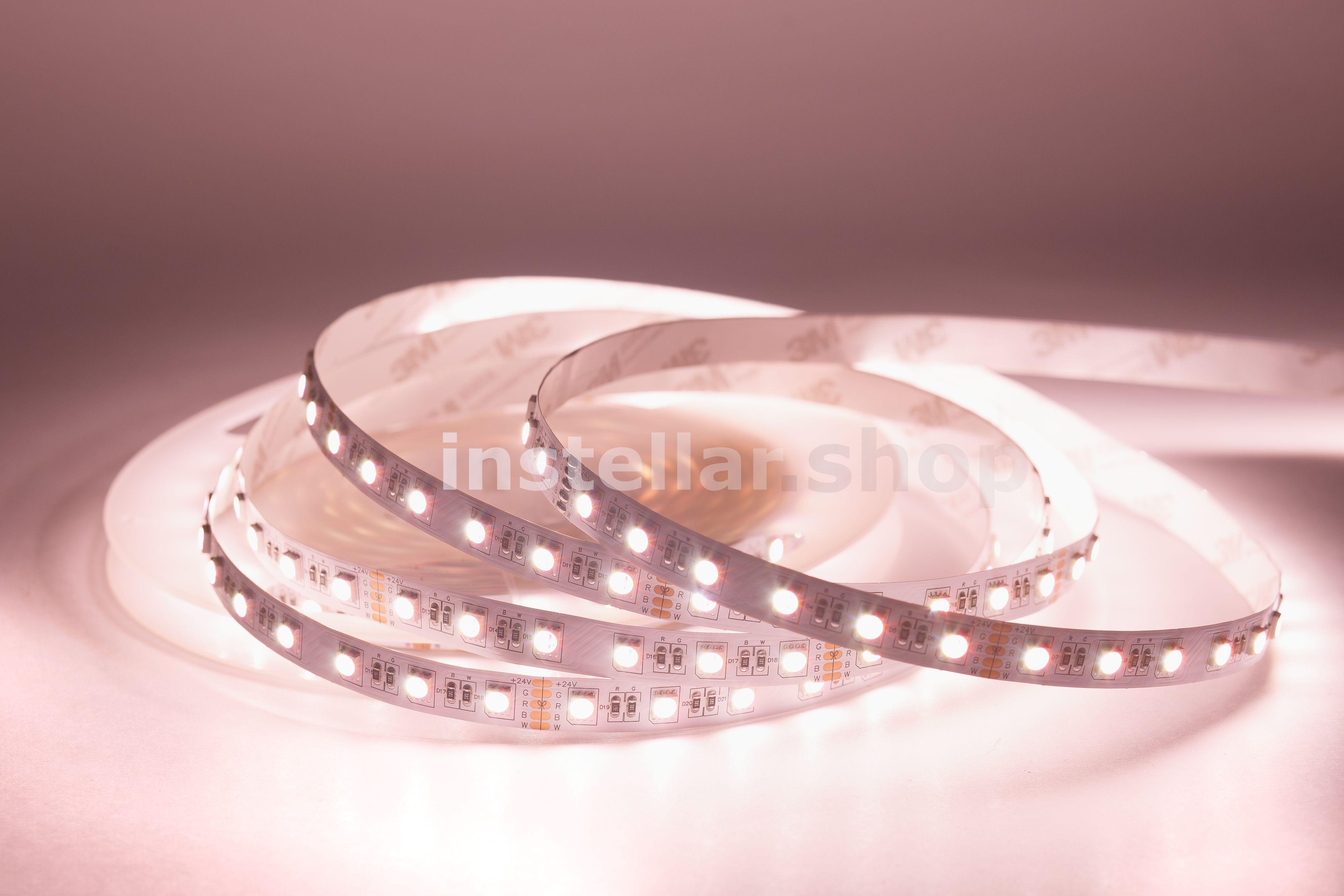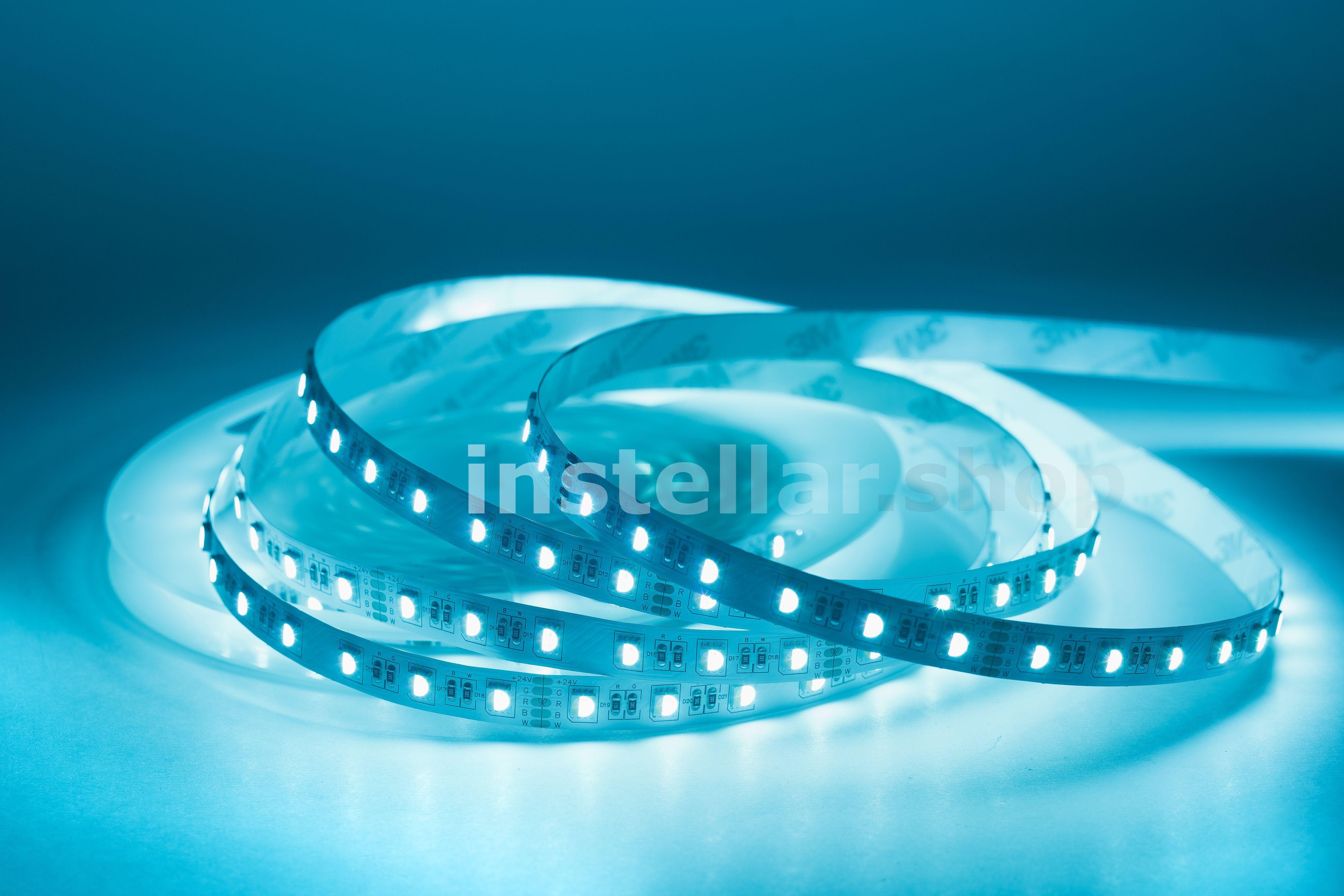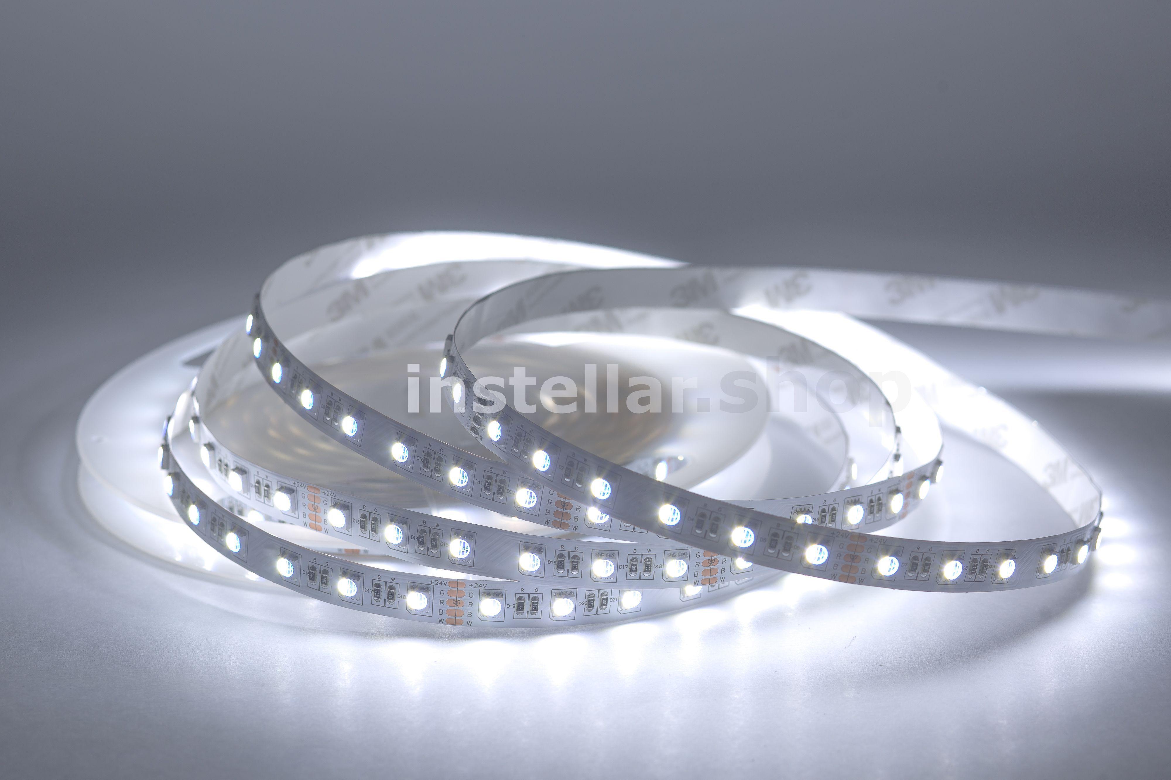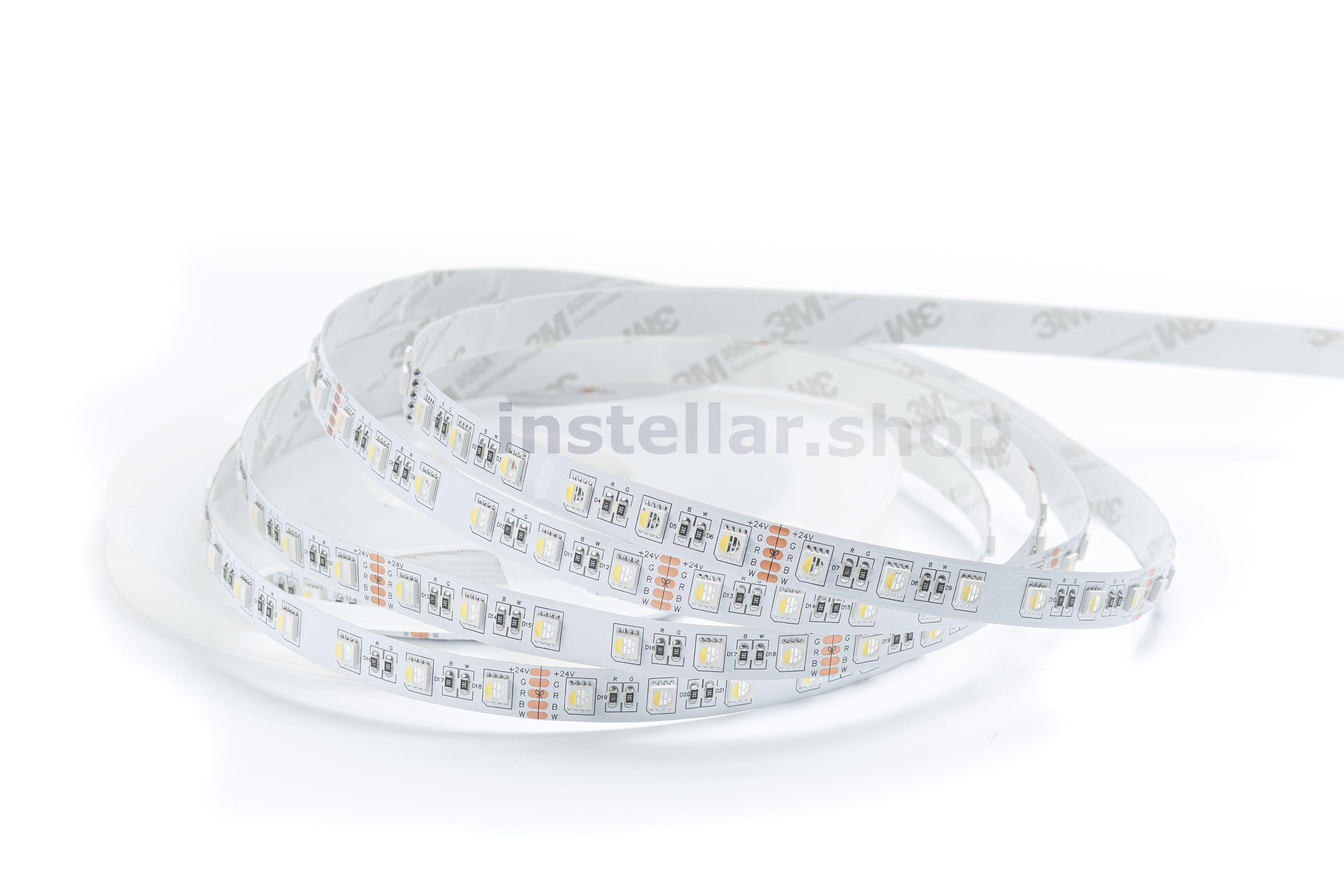 RGB-светодиодная лента — это лента, которая светится в цветах RGB (смешение цветов: красный, зелёный, синий) RGBW/RGB+W — это RGB-лента, в которую добавлен выделенный канал белого цвета. В результате цветовая гамма становится более естественной и детальной, появляется "настоящий" белый цвет. Отличие RGBW и RGB+W заключается в компоновке. В первом случае это один общий светодиод с субпикселями четырёх цветов, во втором — два светодиода: RGB (3 пикселя) + White (1 пиксель). Светодиодная лента на гибкой медной основе с клейким основанием 3М, имеет один ряд RGB светодиодов (совмещенные в одном светодиоде), ширину 12 мм. Тип светодиодов SMD5050 (SMD 5050 — обозначение типоразмера светодиода для поверхностного монтажа (Surface Mounted Device) SMD — аббревиатура, которая означает "устройство, монтируемое на поверхность". 5050 — четырёхзначное число, указывающее на габариты светодиода: ширину — 5 мм, длину — 5 мм. Напряжение питания постоянное 24 вольта 60 светодиодв на 1 метр Класс защиты IP20 (IP20 — маркировка степени защиты оболочки электрооборудования (Ingress Protection Code). Она обозначает комбинацию двух цифр Первая цифра (2) — защита от проникновения твёрдых предметов размером более 12,5 мм (например, пальцев рук, толстых кабелей). Вторая цифра (0) — отсутствие защиты от влаги (конденсата, брызг, дождя и т.д.) Мощность потребления составляет 18 ватт на 1 метр Индекс цветопрередачи CRI > 80 (Значение индекса цветопередачи (CRI, Color Rendering Index) выше 80 означает, что искусственный источник света точно передаёт цвета объектов по сравнению с естественным освещением). Кратность резки составляет 10 см, (это длина шага, позволяющего делить ленту на самостоятельные модули с минимально возможной длиной свечения).