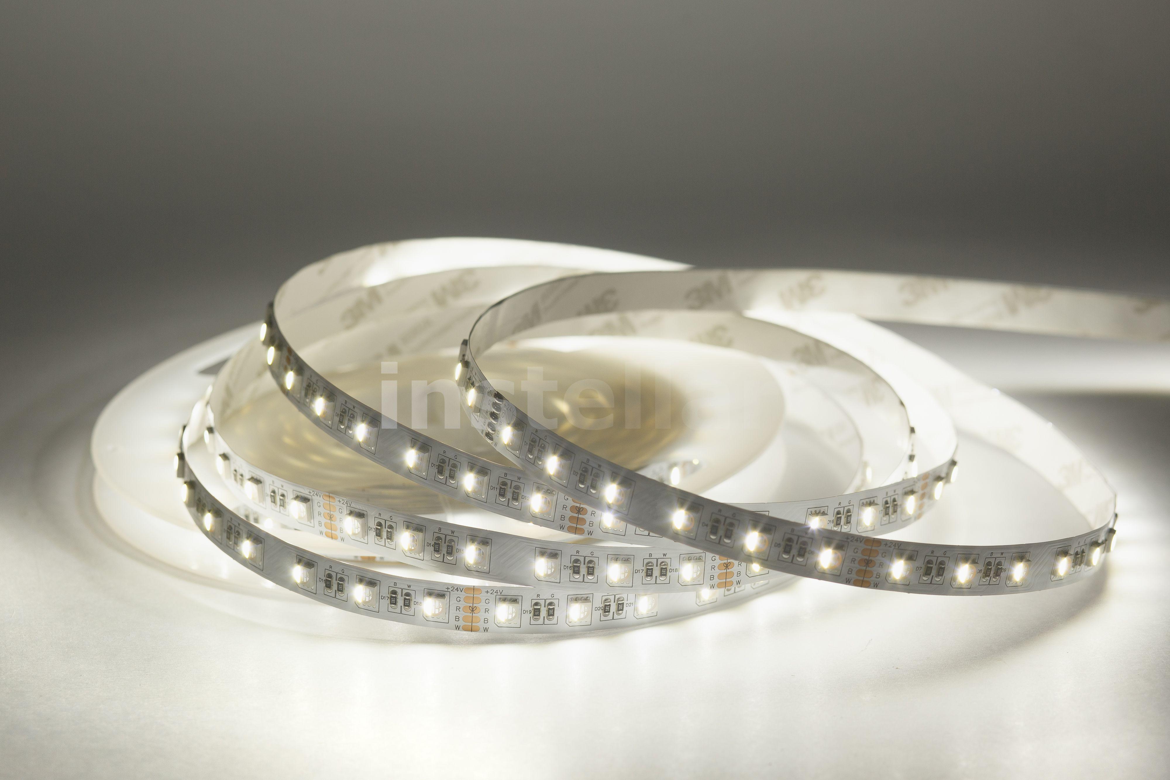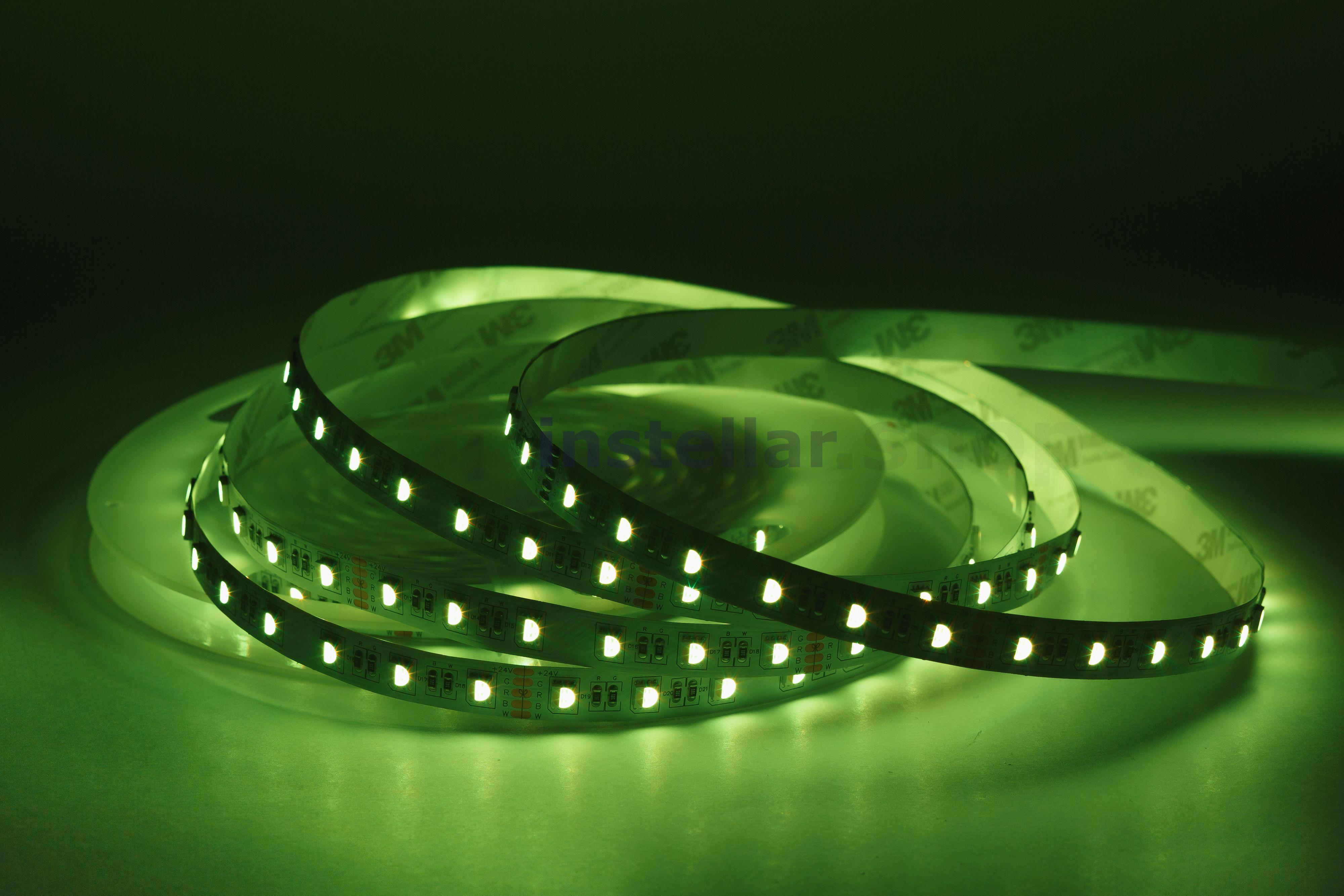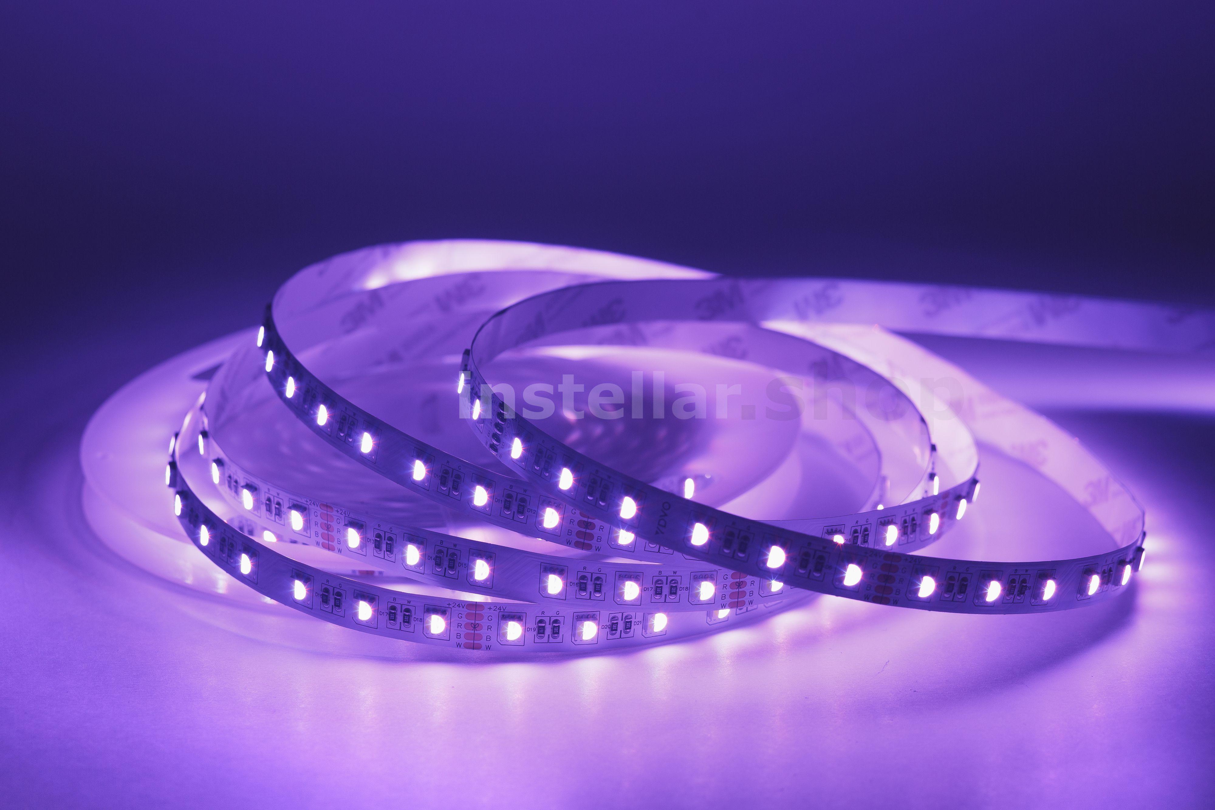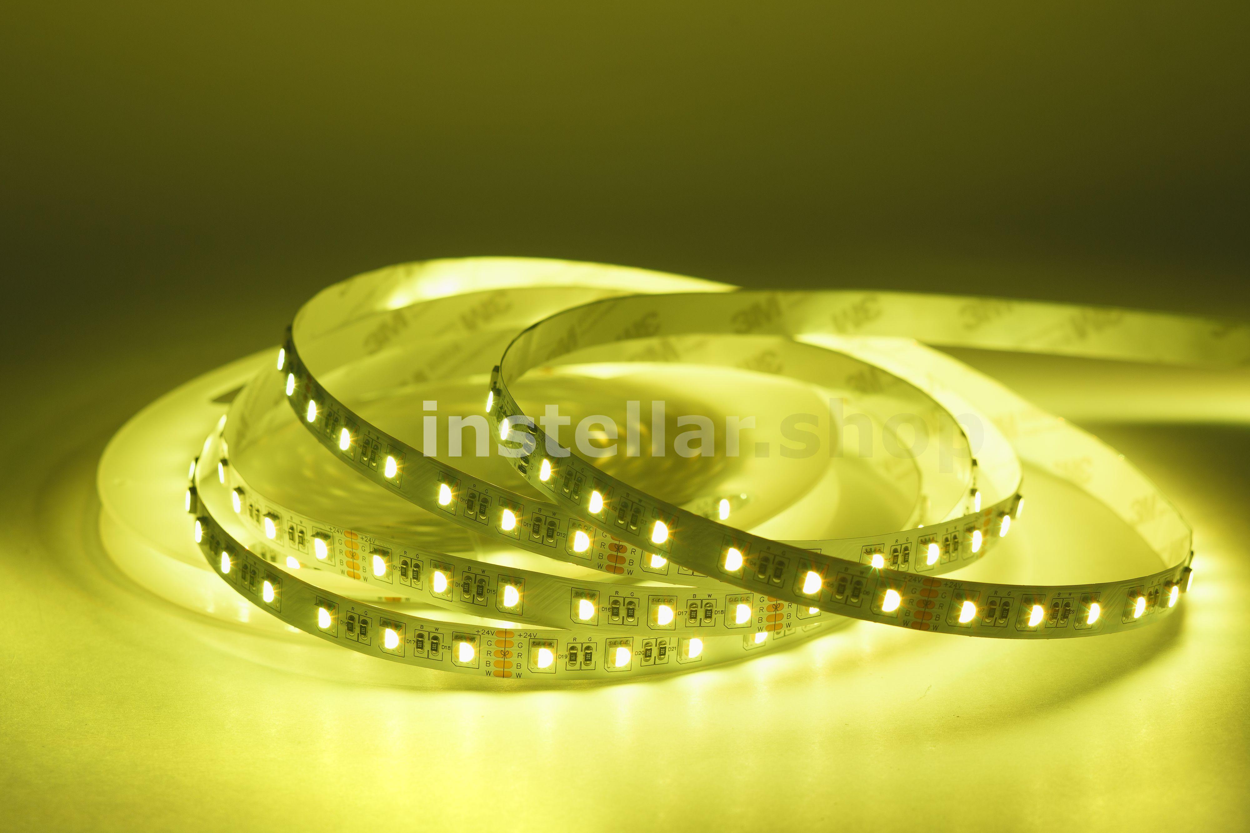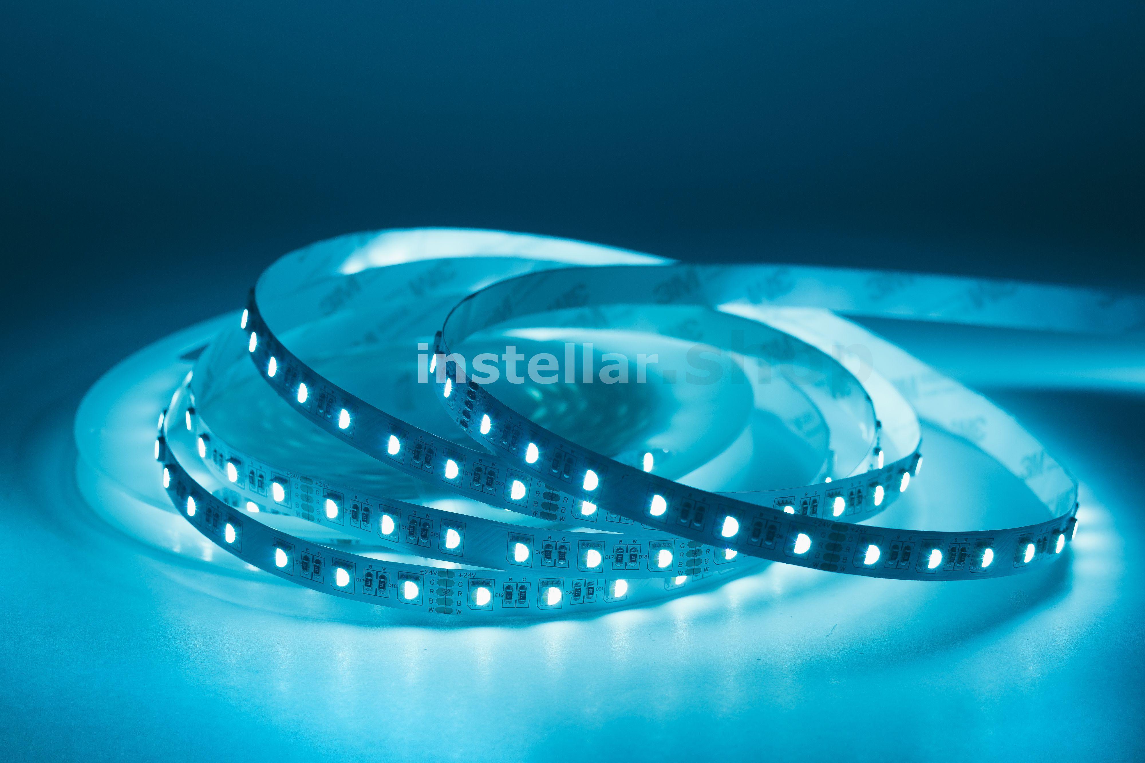 RGB-светодиодная лента — это лента, которая светится в цветах RGB (смешение цветов: красный, зелёный, синий) RGBW/RGB+W — это RGB-лента, в которую добавлен выделенный канал белого цвета. В результате цветовая гамма становится более естественной и детальной, появляется "настоящий" белый цвет. Отличие RGBW и RGB+W заключается в компоновке. В первом случае это один общий светодиод с субпикселями четырёх цветов, во втором — два светодиода: RGB (3 пикселя) + White (1 пиксель). Светодиодная лента на гибкой медной основе с клейким основанием 3М, имеет один ряд RGB светодиодов (совмещенные в одном светодиоде), ширину 12 мм. Тип светодиодов SMD5050 (SMD 5050 — обозначение типоразмера светодиода для поверхностного монтажа (Surface Mounted Device) SMD — аббревиатура, которая означает "устройство, монтируемое на поверхность". 5050 — четырёхзначное число, указывающее на габариты светодиода: ширину — 5 мм, длину — 5 мм. Напряжение питания постоянное 24 вольта 60 светодиодв на 1 метр Класс защиты IP20 (IP20 — маркировка степени защиты оболочки электрооборудования (Ingress Protection Code). Она обозначает комбинацию двух цифр Первая цифра (2) — защита от проникновения твёрдых предметов размером более 12,5 мм (например, пальцев рук, толстых кабелей). Вторая цифра (0) — отсутствие защиты от влаги (конденсата, брызг, дождя и т.д.) Мощность потребления составляет 18 ватт на 1 метр Индекс цветопрередачи CRI > 80 (Значение индекса цветопередачи (CRI, Color Rendering Index) выше 80 означает, что искусственный источник света точно передаёт цвета объектов по сравнению с естественным освещением). Кратность резки составляет 10 см, (это длина шага, позволяющего делить ленту на самостоятельные модули с минимально возможной длиной свечения).